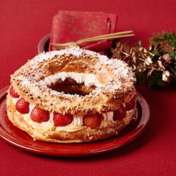 リング状に焼き上げたシュー生地に、クリームをたっぷり詰めました。カスタードクリームは電子レンジで手軽に作れます。