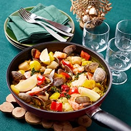 フライパンで手軽に作るパエリア。牛乳を加えて炊くことでコクが加わり、深い味わいに仕上がります。