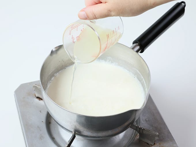 鍋に牛乳と生クリームを入れ弱火にかける。周りがフツフツしたら火を止め、レモン汁を入れ、20秒ほど置いてからやさしく混ぜる。
