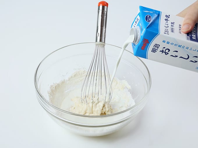 耐熱ボウルに薄力粉をふるい入れ、牛乳を少しずつ加えてダマにならないようにかき混ぜる。
