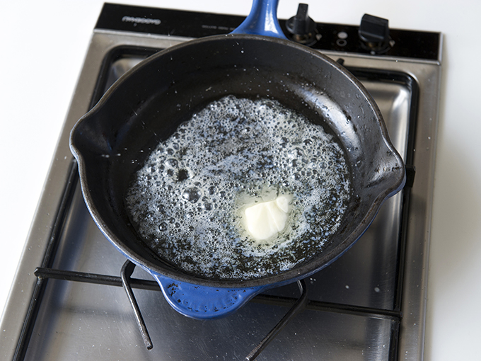 3のフライパンを熱し、4をお玉1杯分程度流し入れ、火を中弱火に落として、縁が乾いて表面にプツプツと穴があいてきたら裏返し、中まで火が通るよう焼く。以下、フライパンに少量のバター(分量外)を溶かし、同様に焼く。