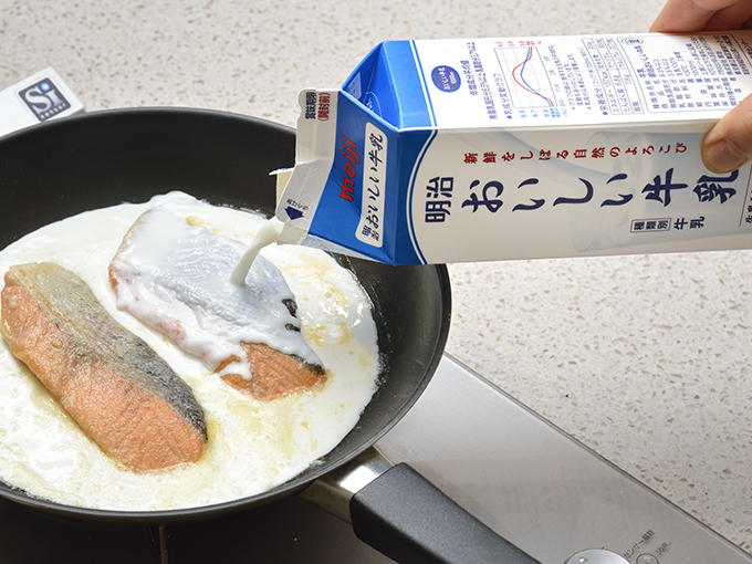 4に「明治おいしい牛乳」を入れ中火で7~8分煮込む。途中5分経ったところでサーモンだけ取り出し3の器に盛る