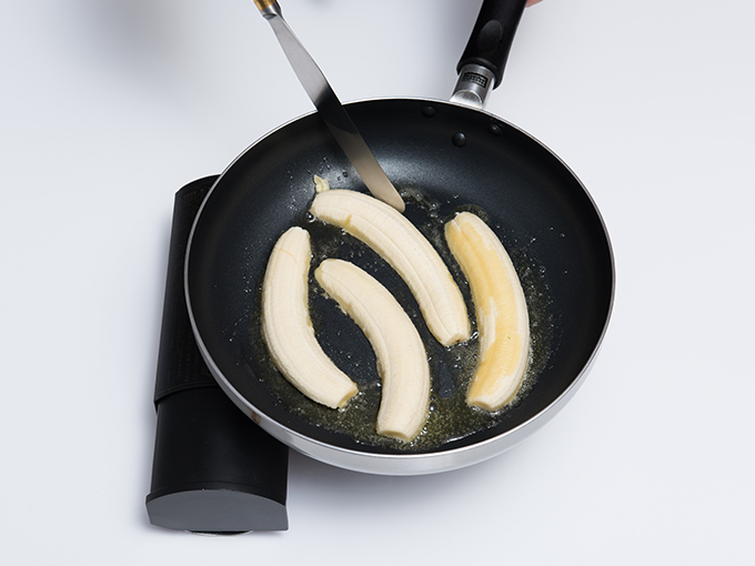 バナナは縦半分に切る。フライパンを熱し、バターを溶かし、バナナをソテーする