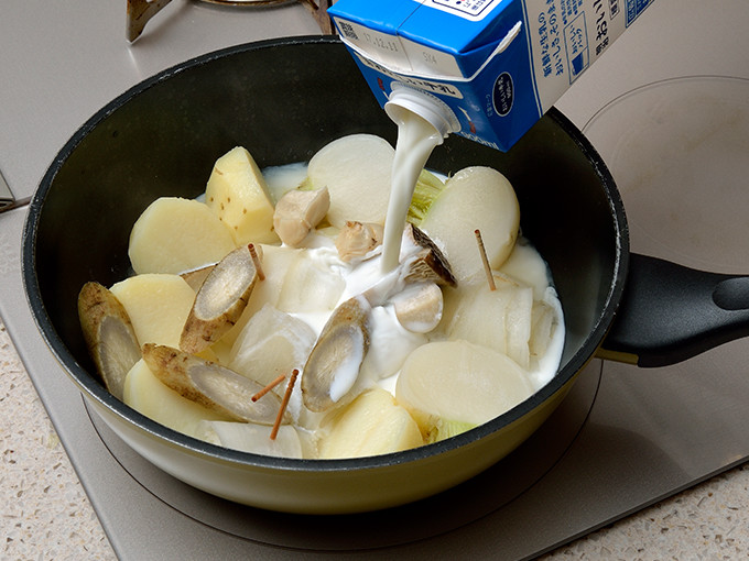 3の具材が柔らかくなったら、牛乳を入れて温め、途中4を入れ塩こしょうで味を調える。