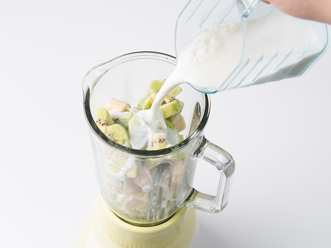 冷凍した果物を使うことで、とろっとした口当たりのスムージーに仕上がります。牛乳、野菜、果物の栄養がギュッとつまった朝にぴったりの一杯です。
