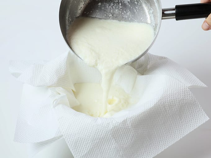 水を切りすぎた場合は、2で出たホエーを少しずつ追加して調整してください。