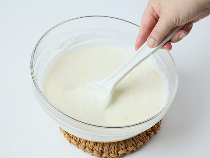 耐熱ボウルに薄力粉をふるい入れ、牛乳を少しずつ加えてダマにならないようにかき混ぜる。
