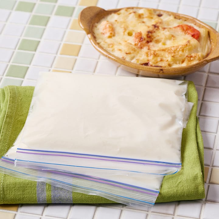 電子レンジで簡単に作れるホワイトソース。牛乳1本分でまとめて作り、小分けにして冷凍保存すれば便利です。