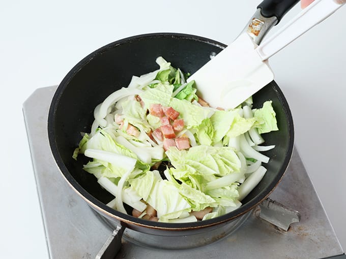 ベーコンは棒状に切る。白菜の葉はざく切りにし、白い芯の部分は4㎝長さの短冊切りにする。玉ねぎは薄切りにする。