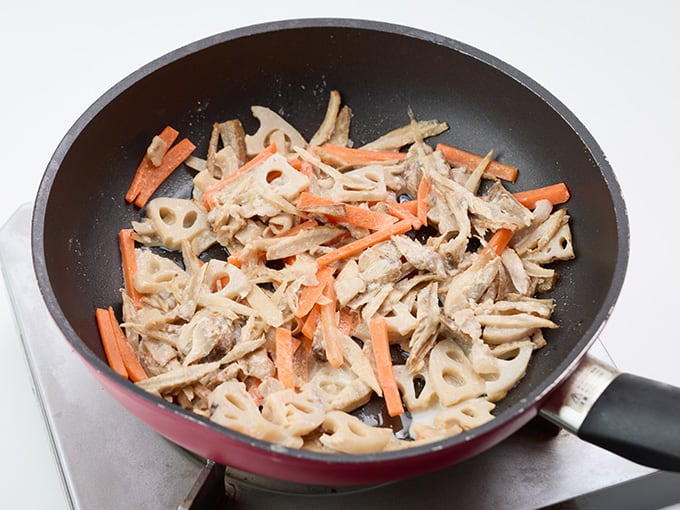 ごぼうは太めのささがきにし水にさらす。にんじんは太めのせん切りにする。れんこんは半月切りまたはいちょう切りにし水にさらす。