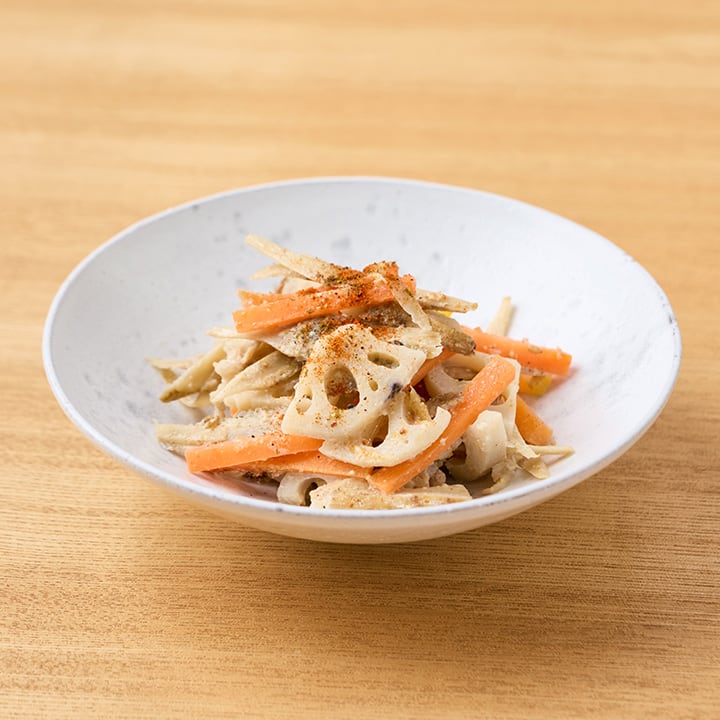 ごまの香ばしさが引き立つ、きんぴらごぼうです。牛乳を加えることで、しょうゆの量をひかえることができるので減塩にもなります。