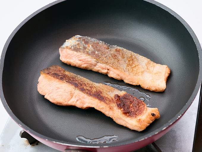 フライパンにサラダ油(大さじ1/2)を入れ、鮭にこしょうをし、小麦粉をつけ、両面しっかりと焼いて、器に盛りつける。