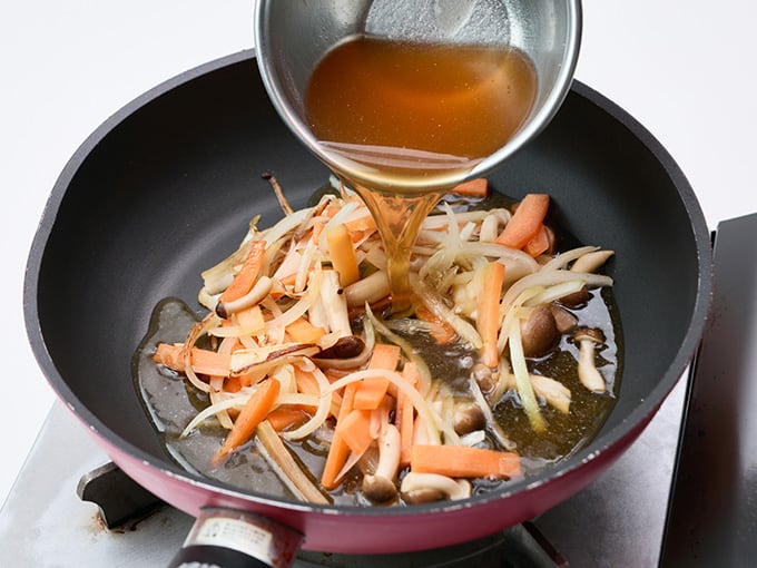 玉ねぎは薄切りにする。しめじは石づきを取り除き、小房にする。にんじんは短冊切りにする。